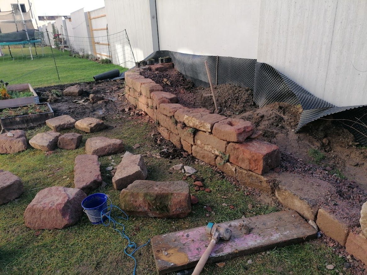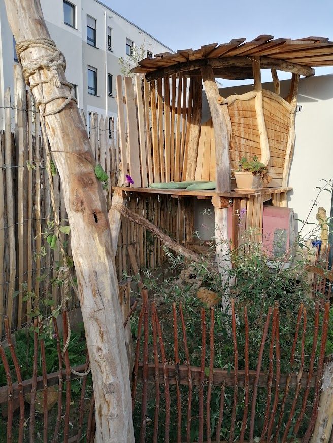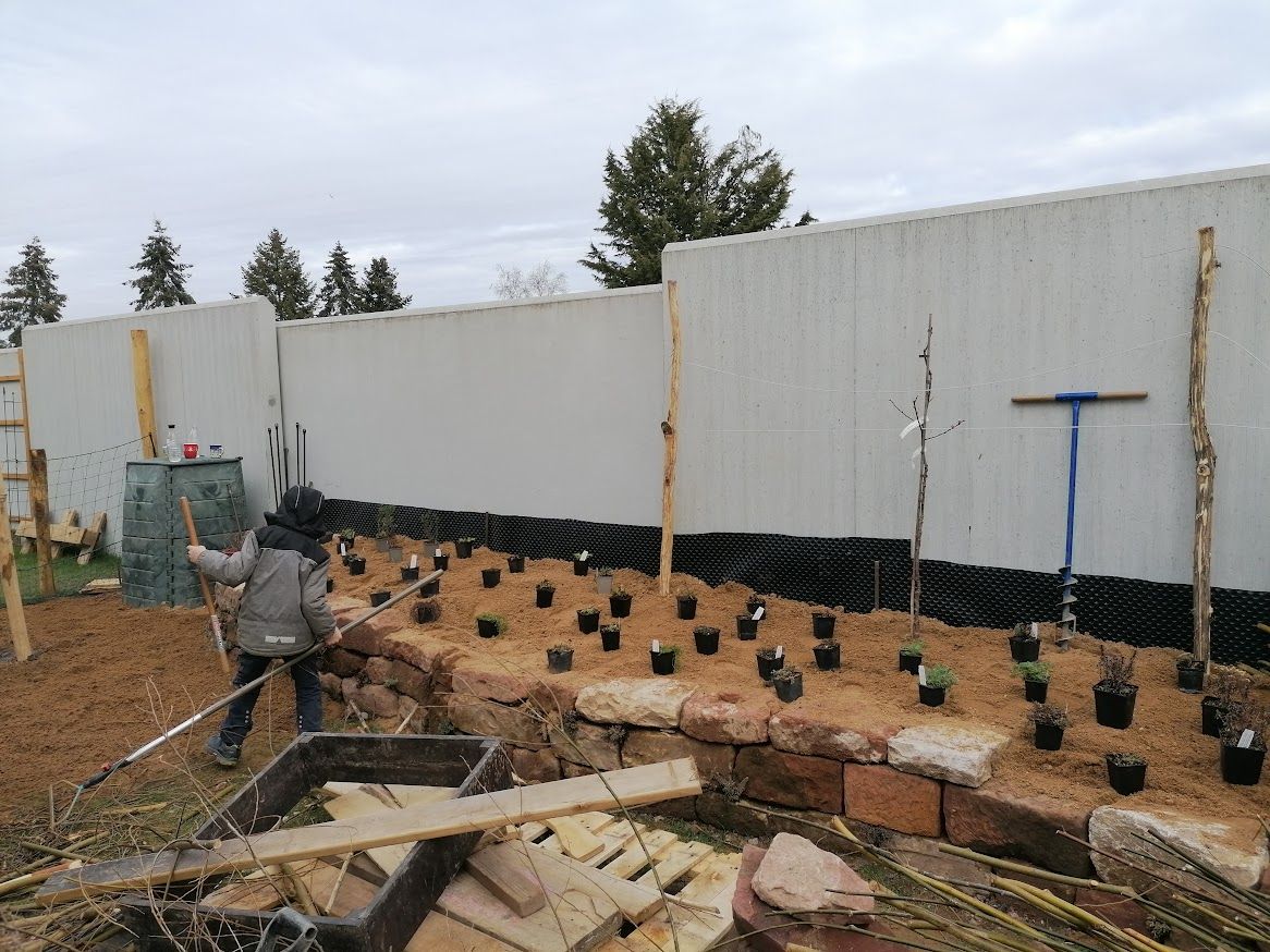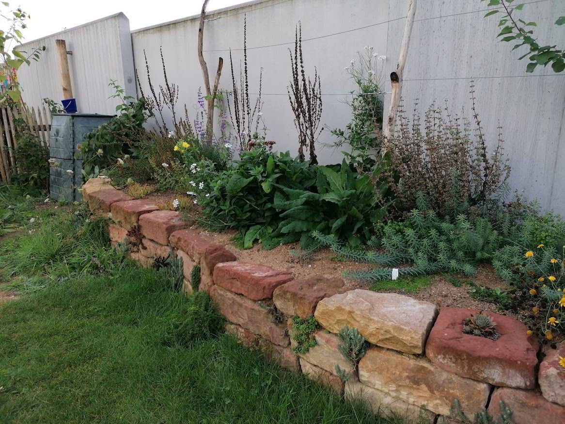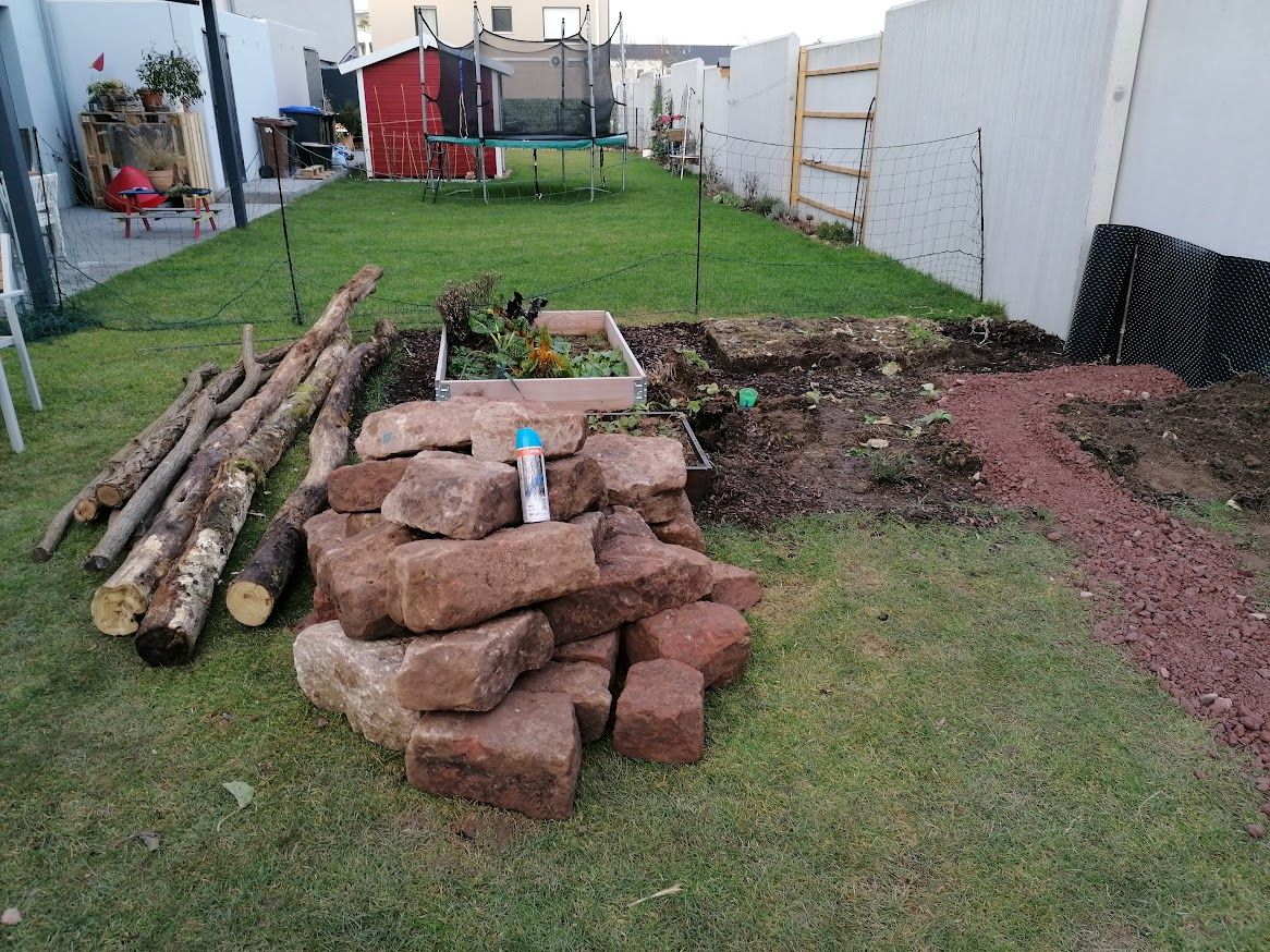 Auf weniger als 100 m² entstand eine vielseitige Gartenlandschaft mit Trockenmauern, Feuerstelle und integriertem Hühnerbereich. Ein Baumhaus verbindet Spielraum für Kinder mit funktionalem Lebensraum für Tiere.