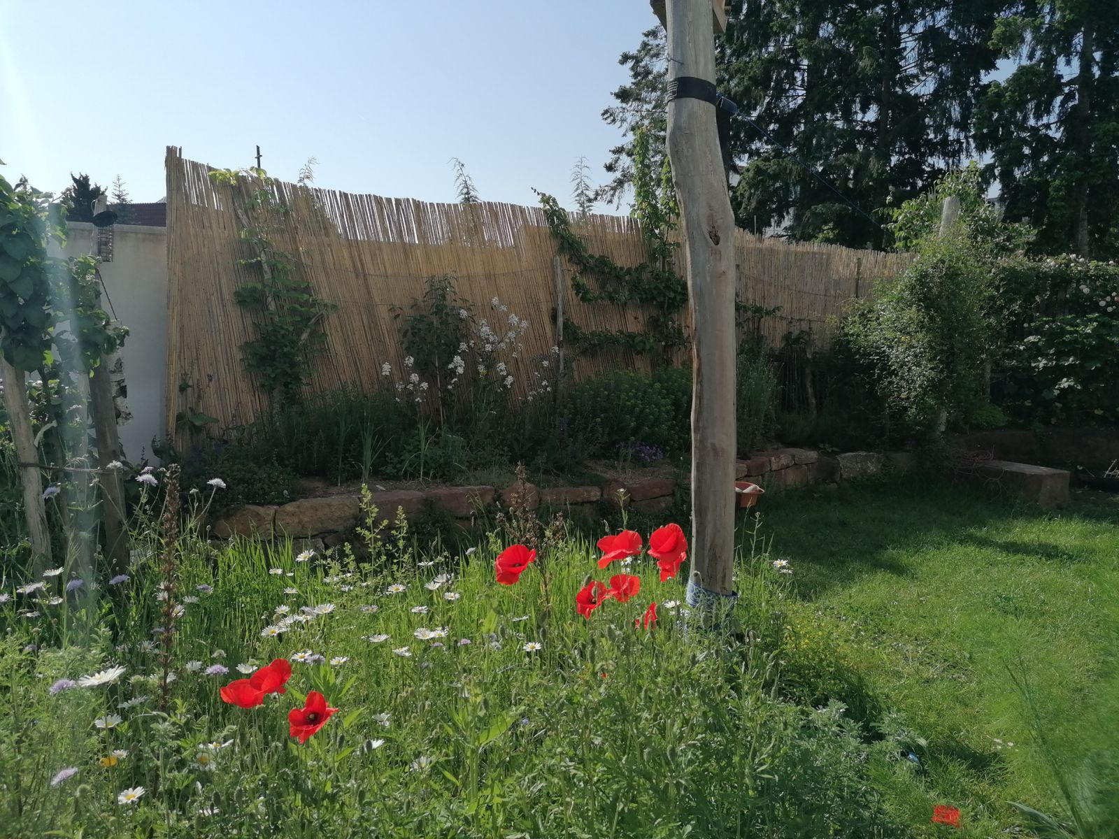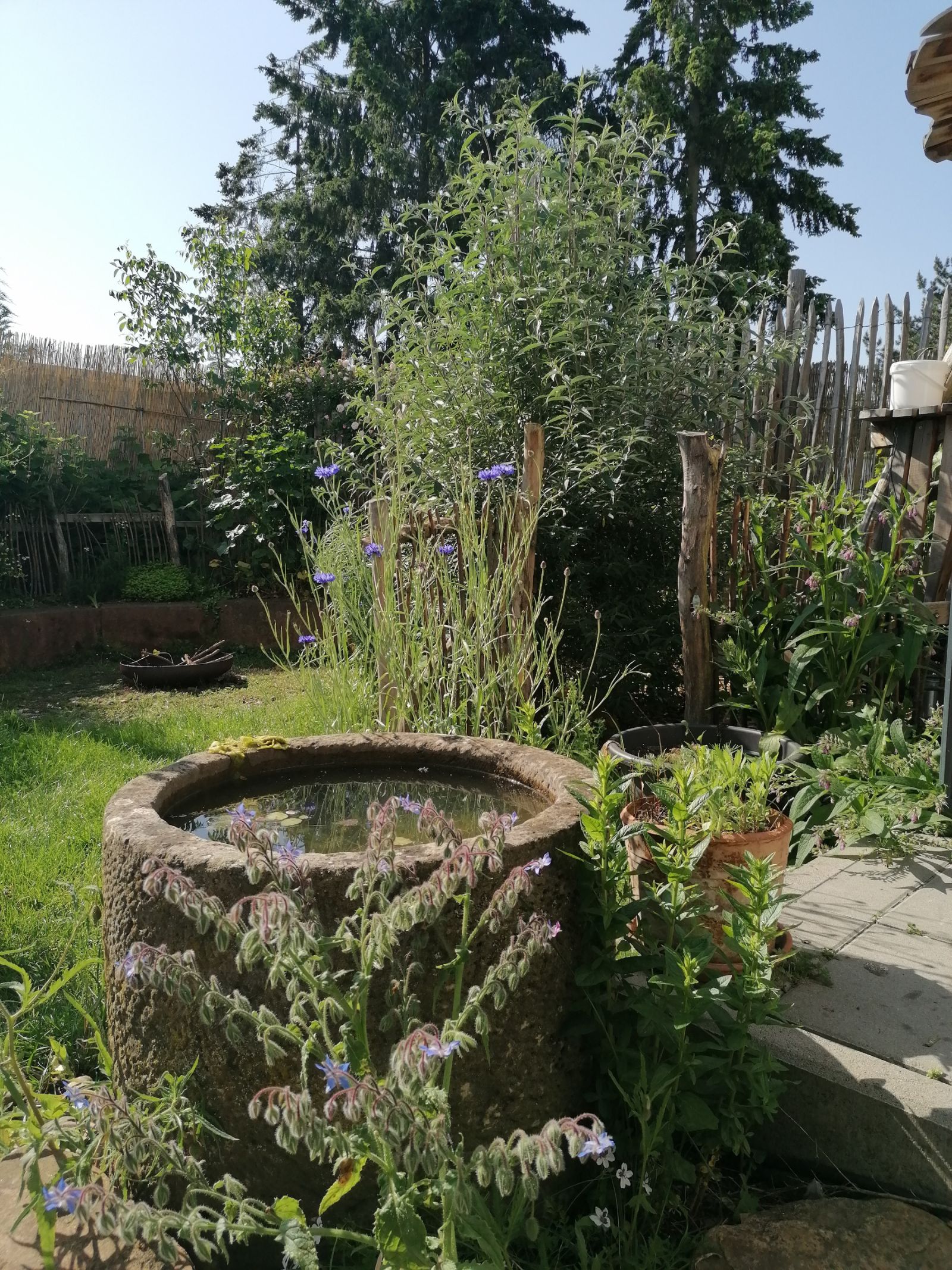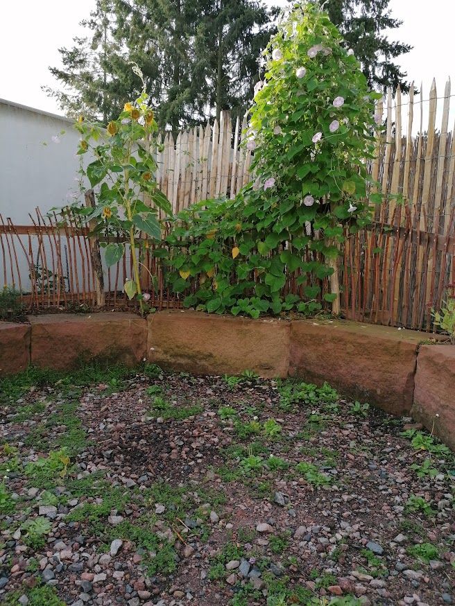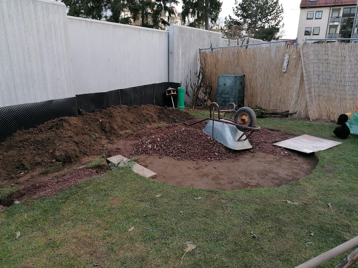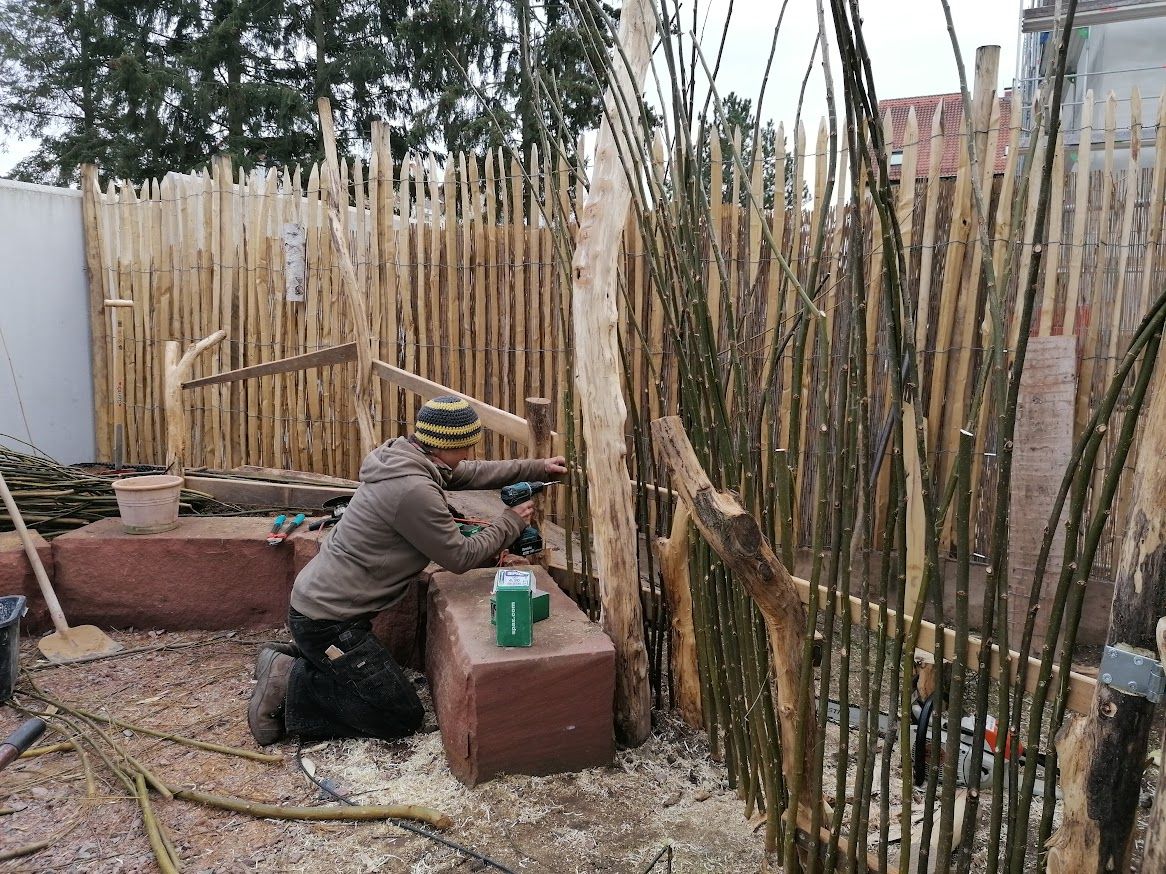 Auf weniger als 100 m² entstand eine vielseitige Gartenlandschaft mit Trockenmauern, Feuerstelle und integriertem Hühnerbereich. Ein Baumhaus verbindet Spielraum für Kinder mit funktionalem Lebensraum für Tiere.