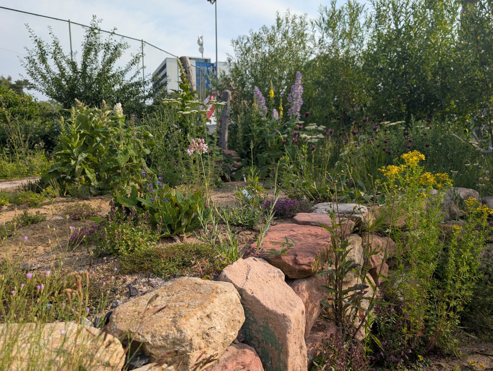 Ein Naturgarten, der durch gezielte Gestaltungselemente weiterentwickelt wurde: Eidechsenburg, Trockenmauern, Magerbeete und ein Sumpfbereich schaffen vielfältige Habitate. Eine Pergola aus Robinienholz bietet Schatten und Aufenthaltsqualität.